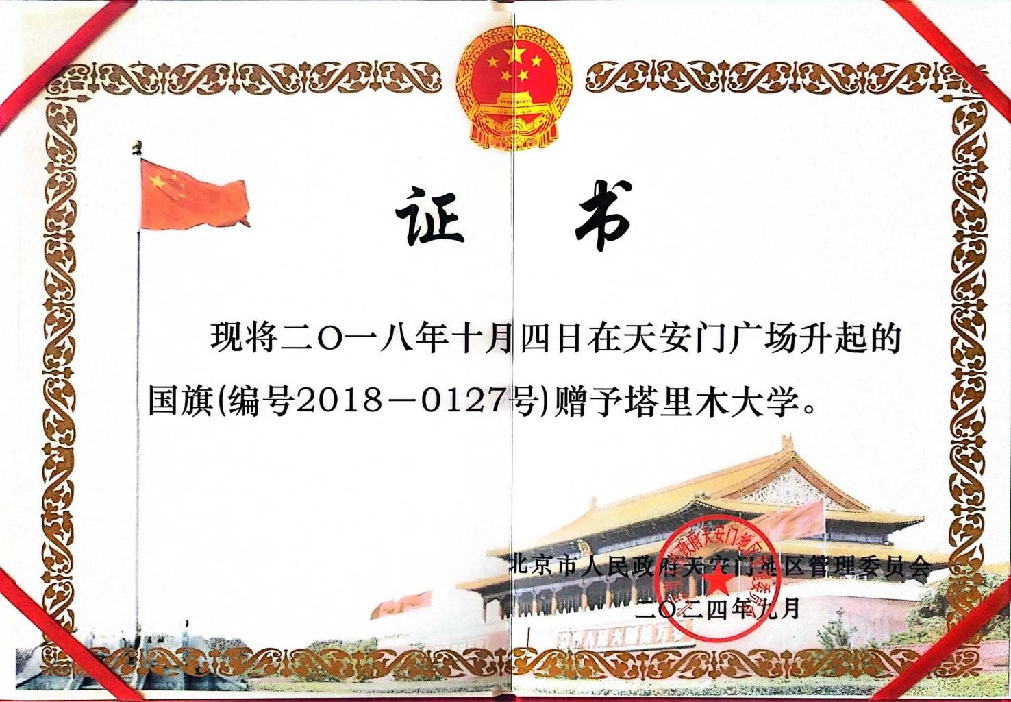 天安门地区管理委员会将这面国旗赠予学校,既是对学校的肯定和褒奖,也是对学校的鼓舞和鞭策。建校66年来,一代代塔大人在五星红旗指引下,践行胡杨精神,始终与党和国家休戚与共、同向同行,与祖国共奋进、与时代共发展、与新疆共命运,谱写了新疆和兵团高等教育改革发展气壮山河的华丽华章。迎领天安门广场国旗,为全体塔大人凝聚了精神力量、积蓄了澎湃动力。这面长5米、宽3.3米的国旗,将在塔里木大学校史馆永久珍藏,供广大师生、校友和社会各界瞻仰。