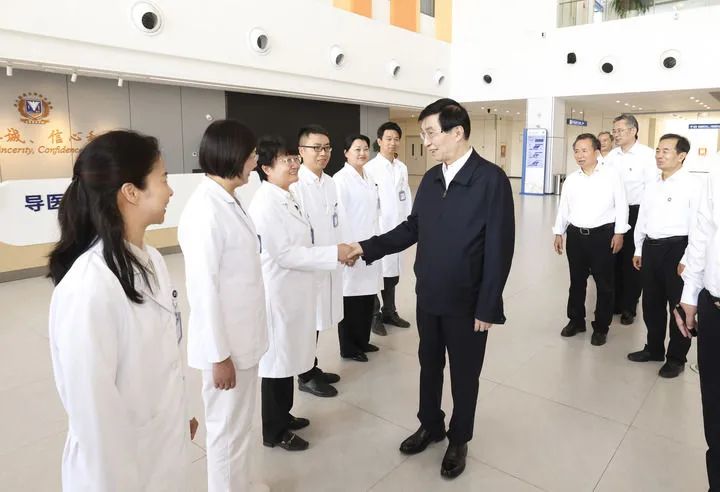 7月7日至9日,第十次全国对口支援新疆工作会议在新疆和田召开。中共中央政治局常委、全国政协主席王沪宁出席并讲话。在新疆期间,王沪宁还到阿克苏、和田和兵团第一师阿拉尔市、第十四师昆玉市等地调研,看望援疆干部人才和基层群众。这是7月7日,王沪宁在浙大邵逸夫阿拉尔医院同援疆医疗人才代表交流。新华社记者 庞兴雷 摄